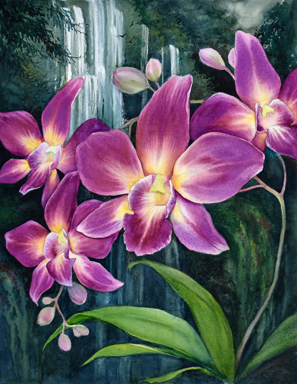 The flowers shown in this painting are based off of the Purple Dendrobium Orchids, which are used to make the beloved and commonly worn orchid leis.