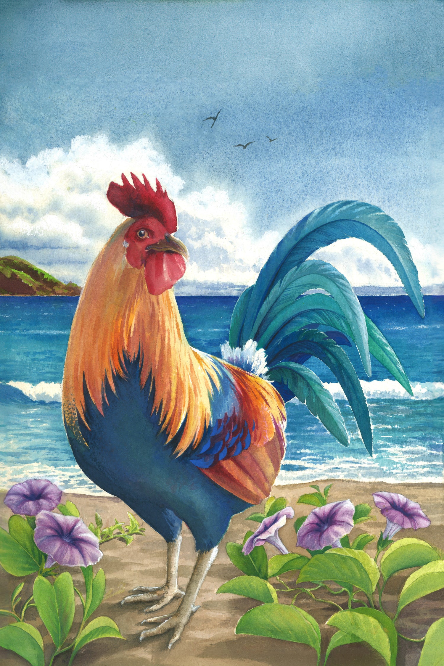 This piece was made for all of those who love or are fascinated by Hawaii's unique avian friends. They say the first chickens of Hawaii appeared after some backyard coops were destroyed in a hurricane, and once they were loose, there was no stopping them from going where they pleased. Now, whether it's the beach, upcountry, or the local grocery store parking lot, these crazy colorful roosters add a pop of color wherever you go in the islands.