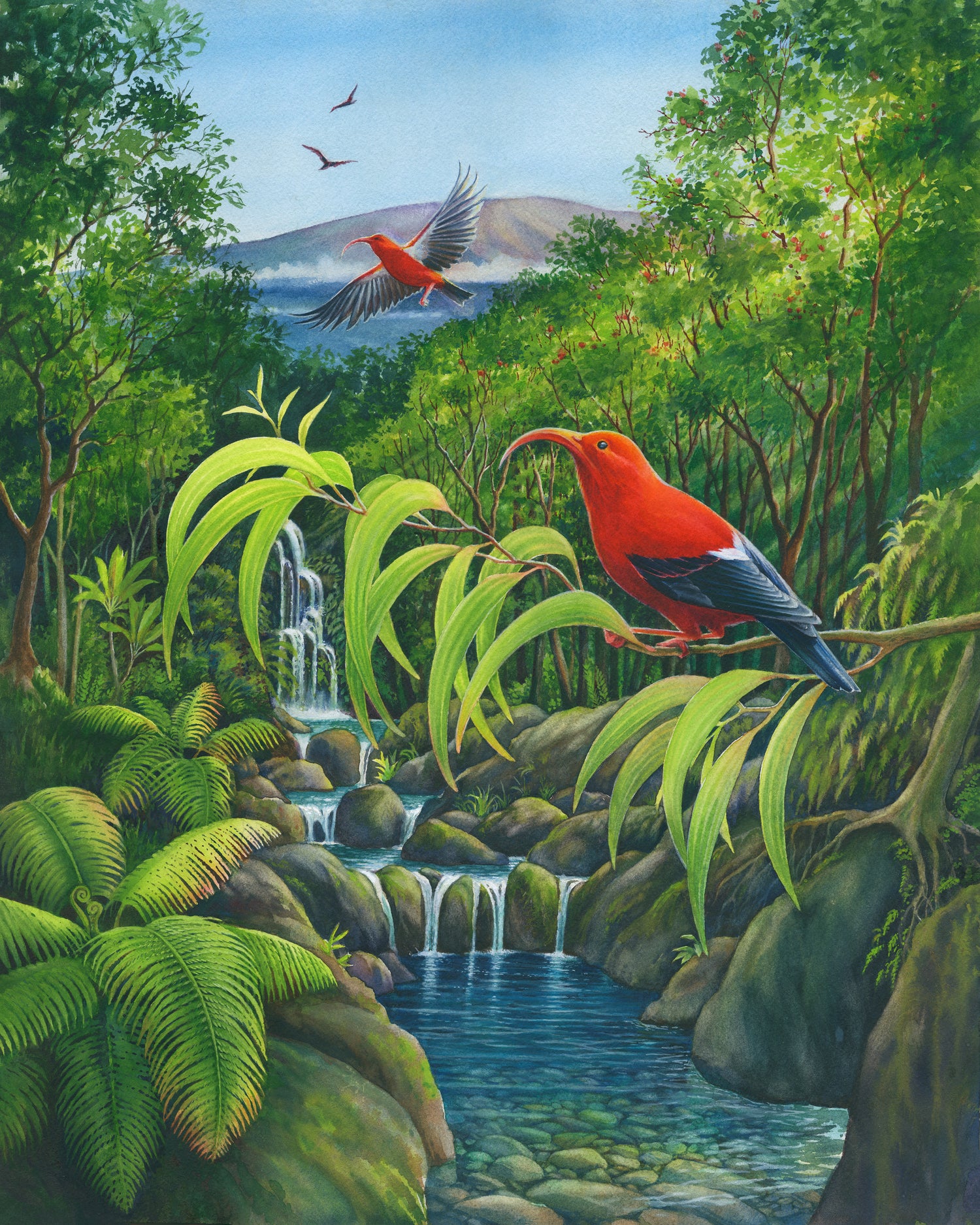 This painting is dedicated to the native species of Hawaii. It was inspired by the forests of east Maui and its winding waterways that are adorned with cascading waterfalls as they carve their way through the Islands descending landscape to the sea, nurturing the abundant fauna all the way down. It is forests like these that use to be brimming with vibrant wild birds found nowhere else on earth. The 'I'iwi is just one of seventeen out of fifty remaining Hawaiian Honey creepers. Today, these remaining birds are the gems of the forest