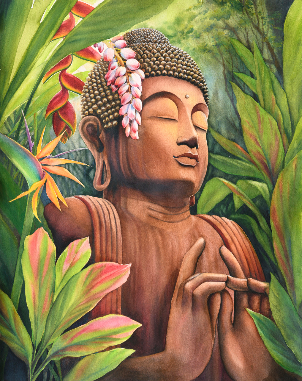 This painting was originally created as a commission piece for a long time friend of mine. One of her favorite places to get away and spend a peaceful afternoon near her home is the Sacred Garden of Maliko, in Makawao. The garden is an exotic oasis that lies on the edge of a gulch within the deep Makawao jungles. It is a serene collection of mesmerizing plants, from giant hanging and climbing orchids, aroids, ferns and succulents, to peaceful and inspiring artistic displays such as this graceful wooden statue of the Buddha.
