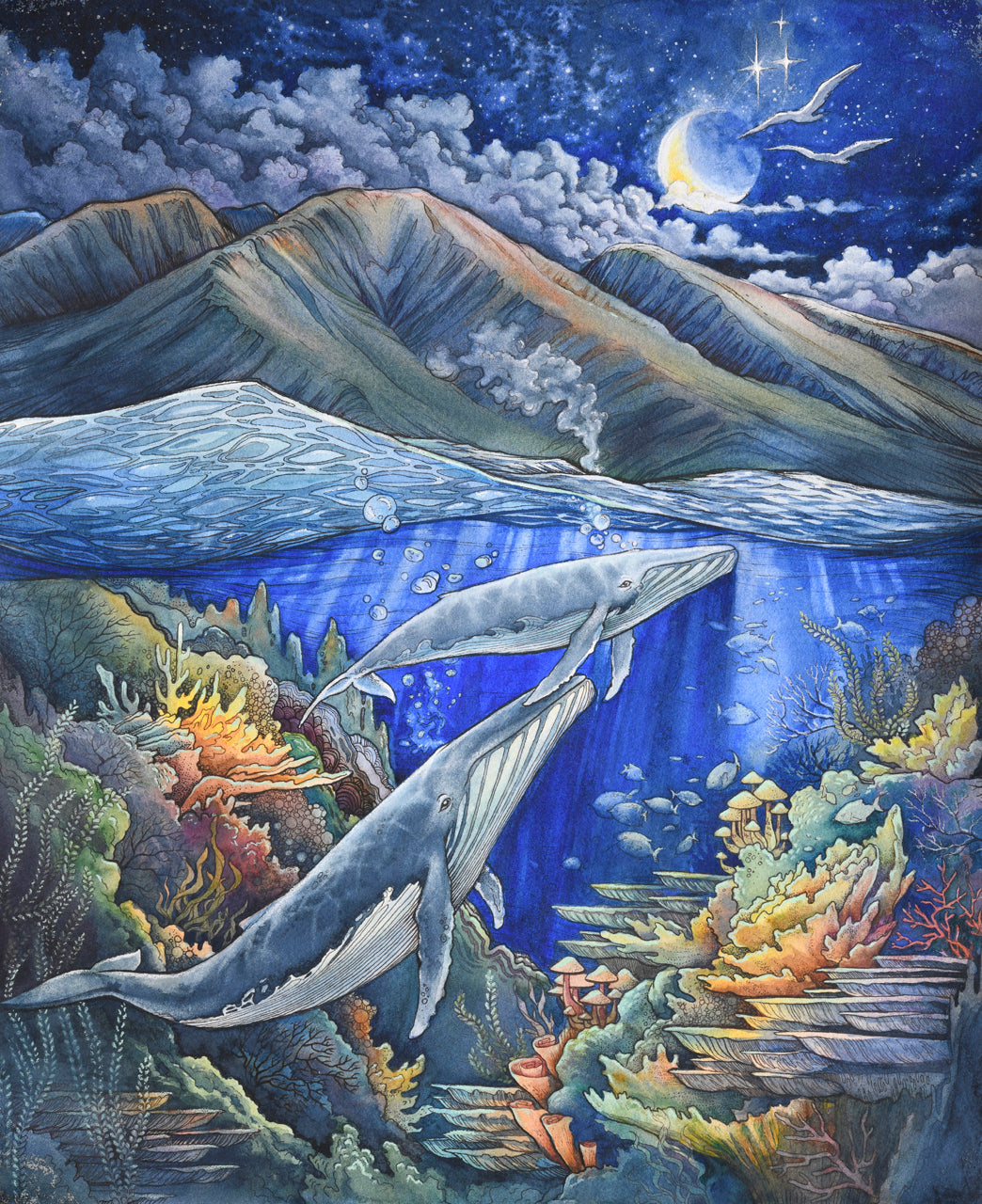 This piece was inspired by the West Maui Mountains, as seen from a Humpback Whale's point of view, looking up above from between ocean and sky. If you look closely within the mountain, you can see a small "heart" nestled into the cervices of these awe strucking Maui Mountains. Should you ever find yourself on that side, look up and see the heart of Lahaina yourself, and look behind you to see the endless peaceful pacific where the whales play under the moonlight.